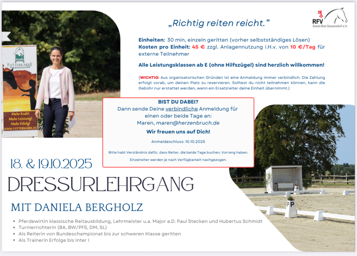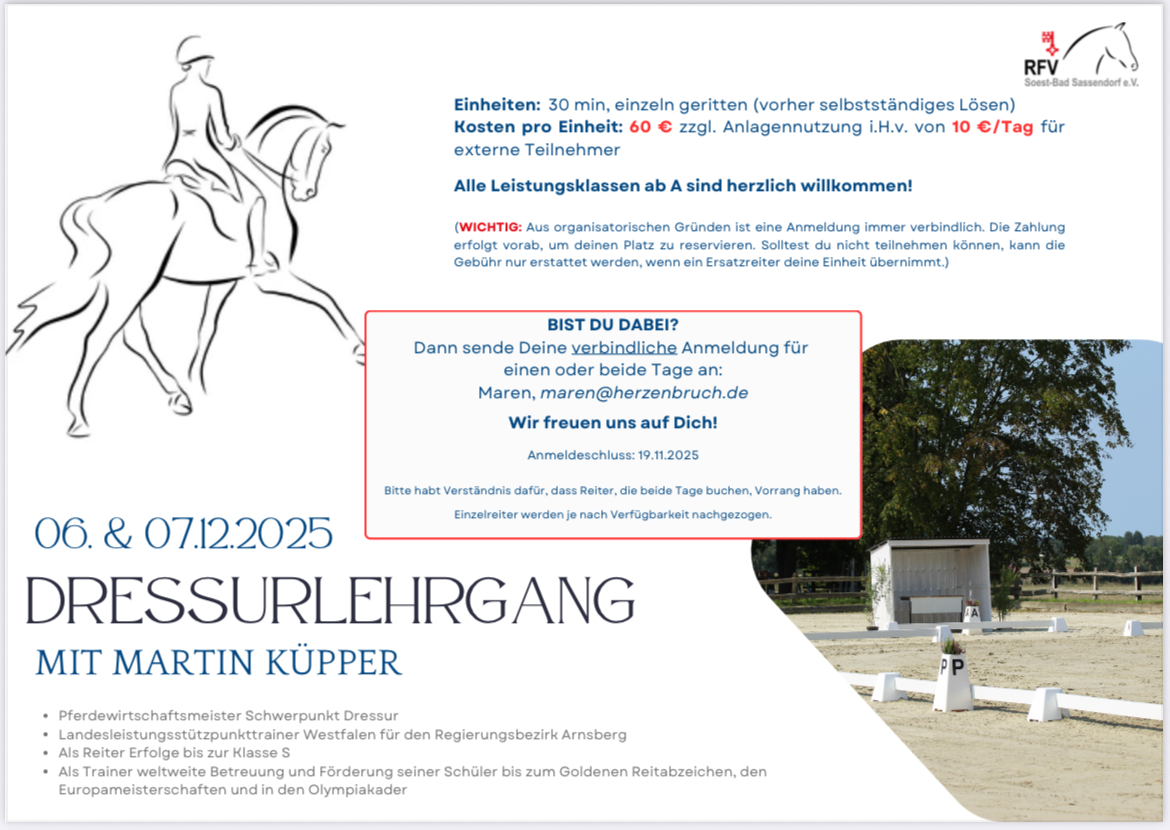 Egal ob Dressur, Springen, Fahren oder einfach die Freude am Umgang mit Pferden – der Reit- und Fahrverein Soest-Bad Sassendorf bietet eine Plattform für alle Pferdeliebhaber, die gemeinsam mehr erleben möchten.